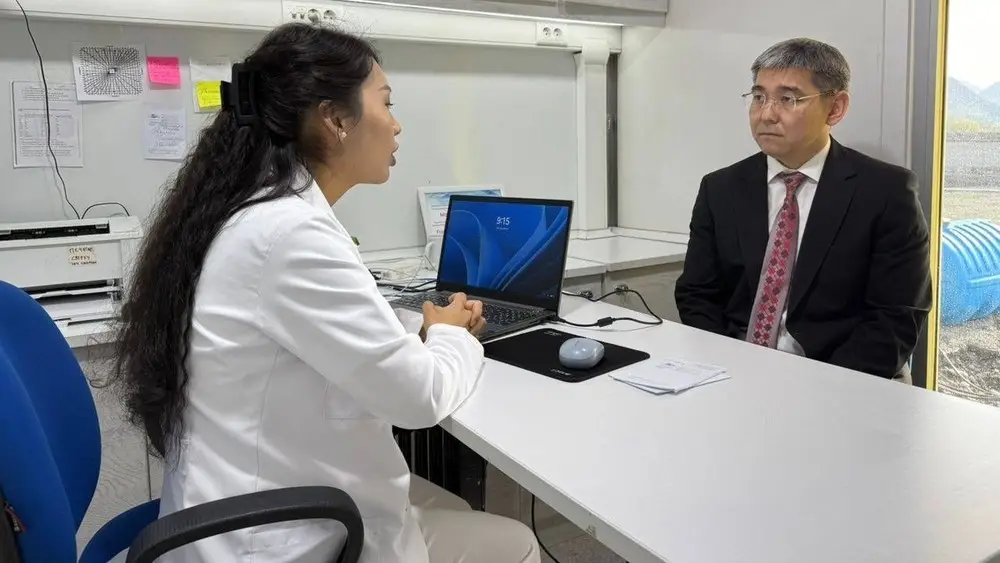 Министр здравоохранения Дамир Осмонов 11 апреля в рамках рабочей поездки в Ошскую область посетил Араванский район и ознакомился с работой мобильной мультидиагностической клиники.